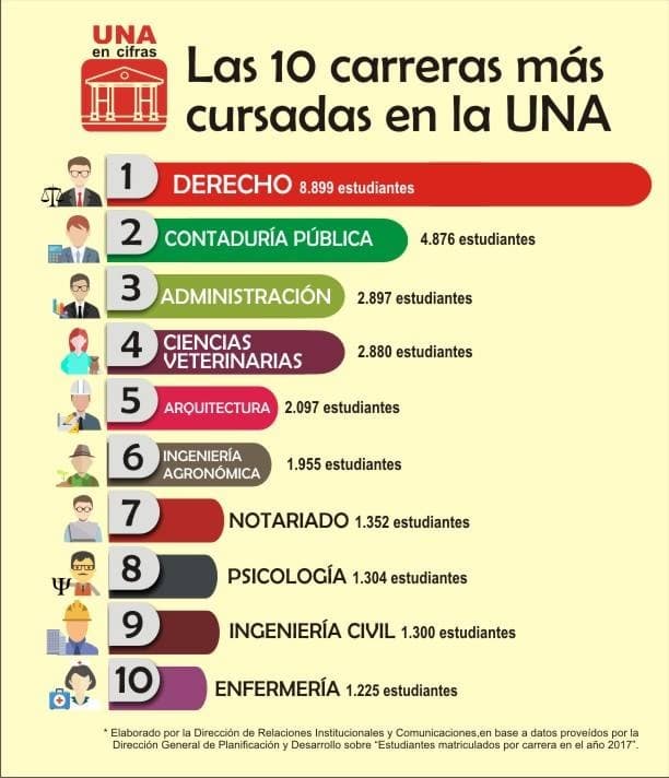 La UNA, desde su cuenta en Facebook, publicó un listado de las 10 carreras más cursadas en dicha casa de estudios.