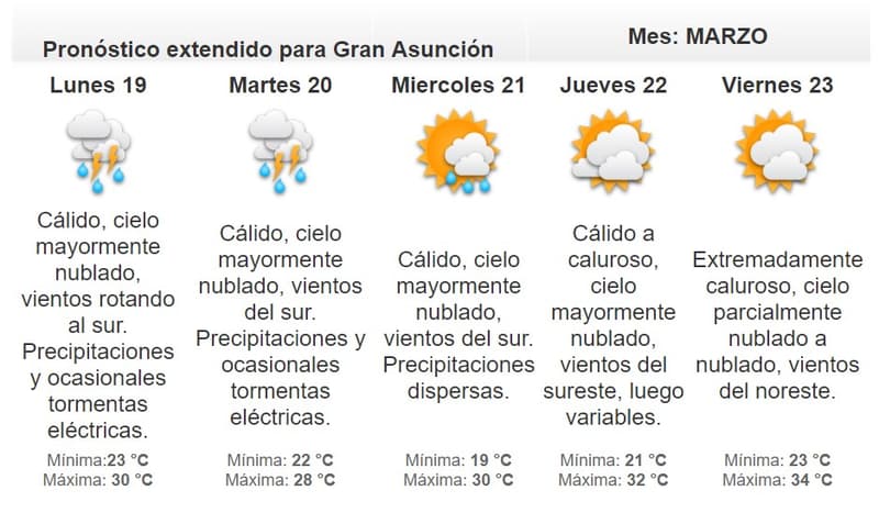 Según la Dirección de Meteorología, las altas temperaturas oscilarán entre los 35°C a 38°C en la Región Oriental y en el Chaco, entre 37°C y 40°C, con algunos chaparrones en horas de la tarde en el noreste y este del territorio nacional.