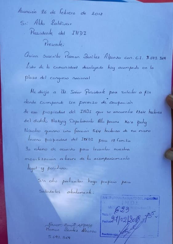 Benítez explicó que solicitó al INDI unas 554 hectáreas en el distrito de Ytakyry, departamento de Alto Paraná, pero no ha recibido ninguna respuesta del ente.