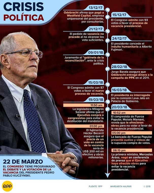 En la mañana de este miércoles, PPK comunicó al Consejo de Ministros su renuncia a la Presidencia de la República, luego de que entre ayer y hoy la bancada de Fuerza Popular difundiera un conjunto de audios, en los que se escucha al ministro de Transportes y Comunicaciones, Bruno Giuffra, y los congresistas del bloque de Kenji Fujimori ofrecer obras a cambio de votos para evitar su vacancia, informó El Comercio.