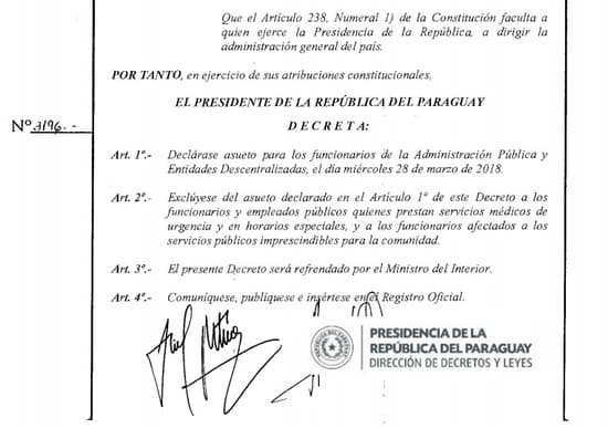 El Presidente de la República, Horacio Cartes, decretó asueto para los funcionarios de la administración pública y entidades descentralizadas por Semana Santa.