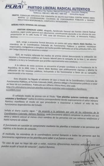 Manifestó que la situación ha llegado al extremo de que, a través de la Coordinadora de Funcionarios Públicos el Partido Colorado (ANR), el candidato plantea obligar a los funcionarios públicos a votar en favor de sus candidaturas, utilizando planilla para controlar los votos de estatales y familiares.