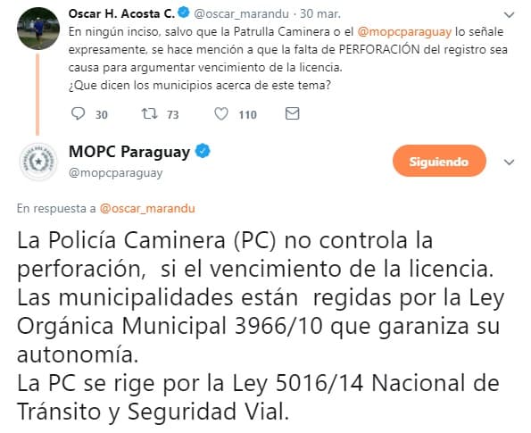 Ante la consulta realizada por el periodista Óscar Acosta al MOPC, mediante su cuenta de Twitter sobre las atribuciones de la Patrulla para multar a quienes no tengan las perforaciones de su registro de conducir al día, la institución respondió que la Patrulla Caminera no puede controlar las perforaciones, ya que la Ley Orgánica Municipal 3966/10 establece la autonomía de los municipios.