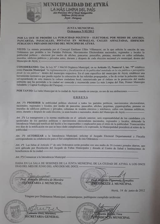 En tanto que el actual jefe comunal, Juan Carlos Matto, manifestó que es un orgullo para los atyreños ver a su ciudad libre de propagandas proselitistas.