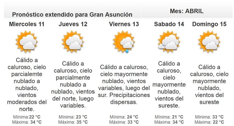 Violeta González, meteoróloga de turno, señaló en su informe que el ambiente se mantendrá cálido durante las mañanas y las noches. No obstante, en horas de la tarde se tornará más calurosa en gran parte del territorio nacional.