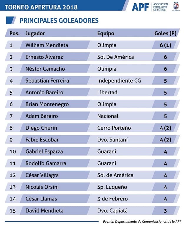 Los principales goleadores del torneo son William Mendieta, de Olimpia; Ernesto Álvarez de Sol de América y Néstor Camacho de Olimpia, todos con 6 dianas.