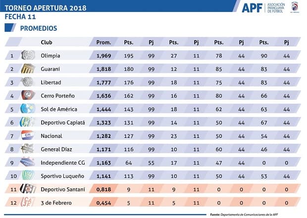 Los equipos con promedios complicados son los recién ascendidos 3 de Febrero y Santaní, seguidos por Sportivo Luqueño e Independiente CG.