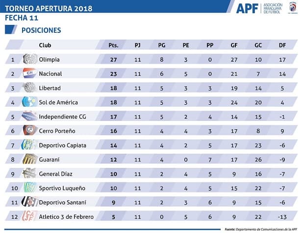 El líder absoluto del Torneo Apertura es Olimpia que saca una ventaja de cuatro puntos a su inmediato escolta Nacional.