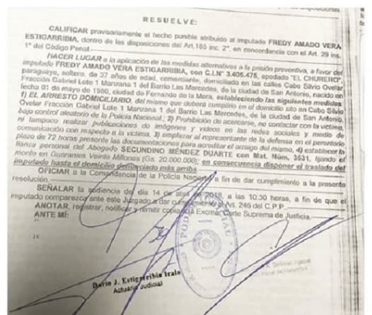 También se le impuso una fianza personal al abogado defensor, de G. 20 millones, según el documento que publicó el letrado de Vera, Nino Méndez (ver documento abajo).