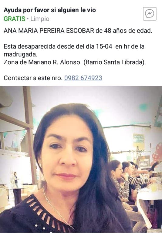 Ana María Pereira Escobar, de 48 años, salió de su domicilio ubicado en el barrio Santa Librada de Marianao Roque Alonso, el lunes 16 en horas de la madrugada.