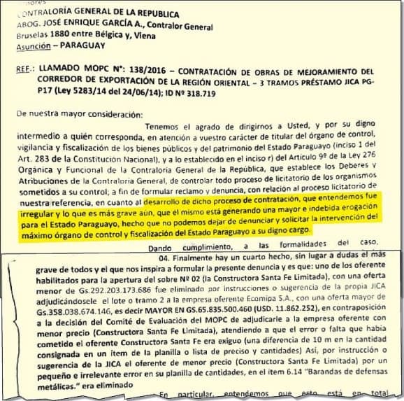 La denuncia fue hecha ante la Contraloría y Procuraduría, y se responsabiliza al MOPC, cuyo titular es Ramón Jiménez Gaona, y también al comité de evaluación conformado por Dionisio Mereles Verón, Esteban Sarubbi Lutz y el viceministro Juan Manuel Cano, reportó ABC Color.