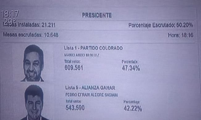Con más del 50% de las mesas escrutadas, se vislumbra la victoria de Mario Abdo Benítez. La diferencia es de unos 5 puntos porcentuales sobre el liberal Efraín Alegre.
