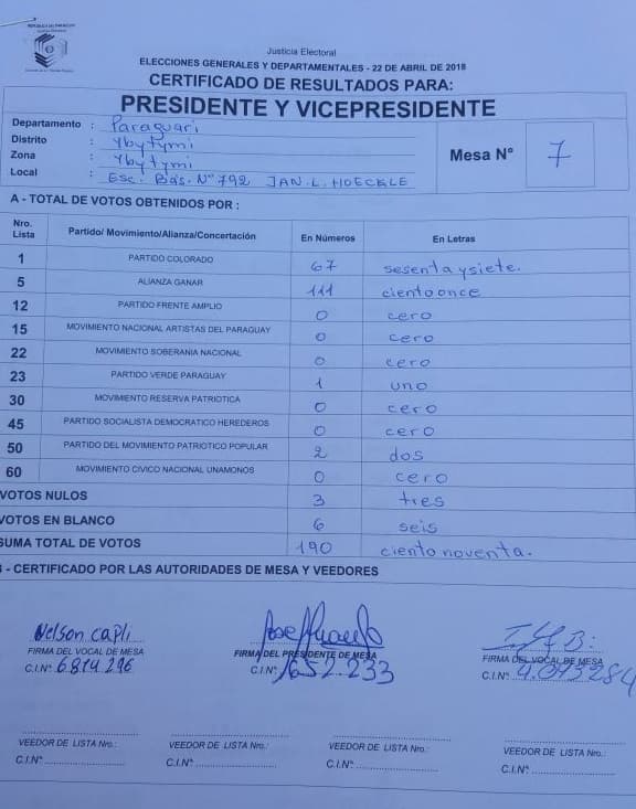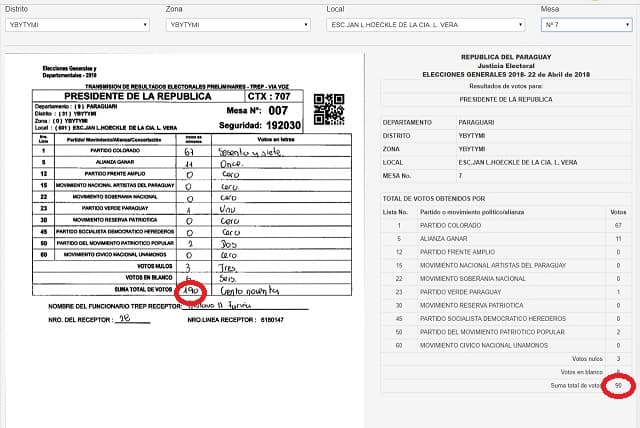 Citó un caso, en Paraguarí, donde en lugar de consignar 111 votos para la Alianza fueron anotados apenas 11, en la Transmisión de Resultados Electorales Preliminares (TREP). Ver detalles abajo.