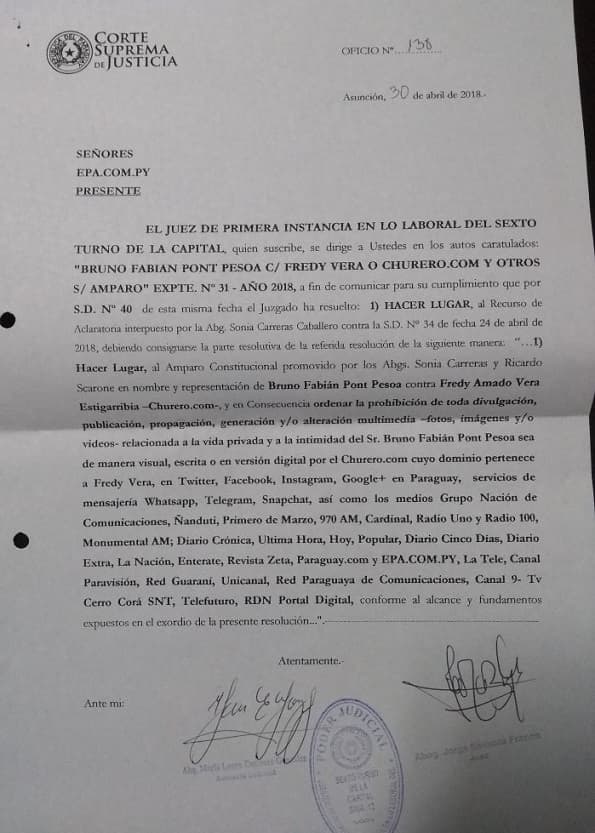 El escrito expresa: “Ordenar la prohibición de toda divulgación, publicación, propagación, generación y/o alteración multimedia –fotos, imágenes y/o videos- relacionada a la vida privada y a la intimidad del Sr. Bruno Fabián Pont Pesoa será de manera visual, escrita o en versión digital por el Churero.com cuyo dominio pertenece a Fredy Vera, en Twitter, Facebook, Instagram, Google+ en Paraguay, servicios de mensajería WhatsApp, Telegram, Snapchat, así como los medios…”