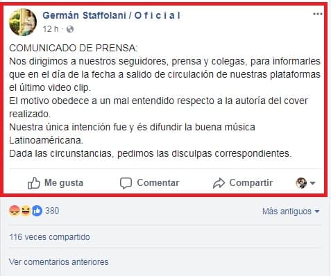 Antes de hablar, el artista emitió un comunicado en el que pidió disculpas. Posteriormente, el perfil de Facebook fue eliminado. Abajo los detalles.