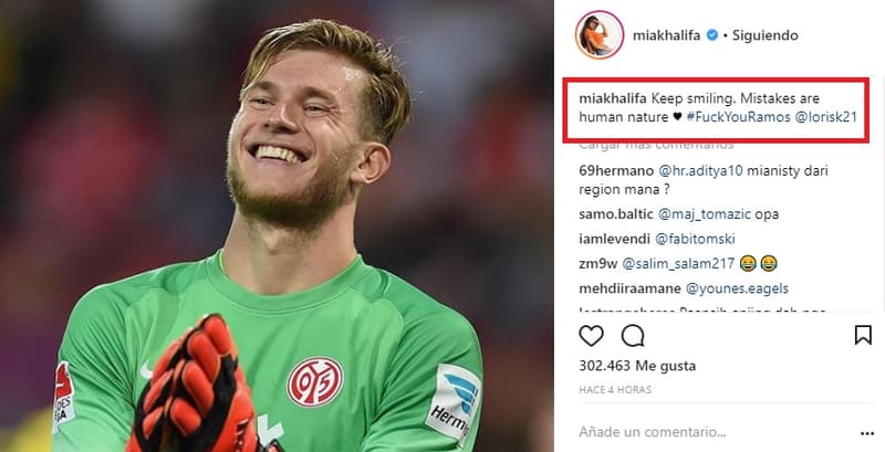 “Sigue sonriendo. Los errores son humanos”, fue lo que escribió Mia adjuntando una imagen del golero. Por otro lado, redactó un hashtag condenando a Ramos, quien ocasionó una lesión al delantero Mohamed Salah, de los rojos.