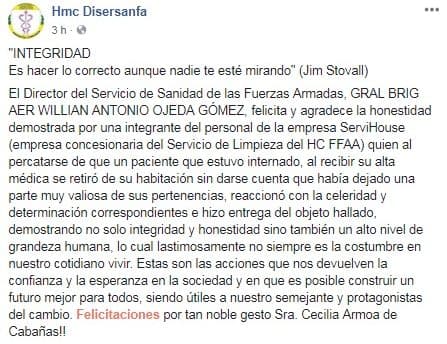 Armoa fue felicitada por las autoridades del Hospital Militar quienes resaltaron su honestidad a través de las redes sociales.