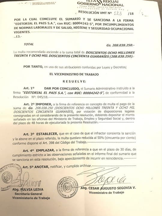 El Sindicato de Periodistas del Paraguay (SPP) resaltó la multa aplicada a Editorial El País (diario Última Hora, del Grupo Vierci) por incumplimiento de normas laborales por parte del Ministerio del Trabajo.