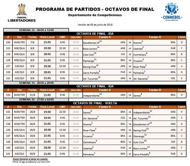 La Confederación Sudamericana de Fútbol (Conmebol) dio a conocer las fechas y los horarios de todos los encuentros de octavos de final de la Copa Libertadores 2018.