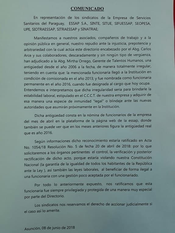 El presidente del Sindicato de Trabajadores de la Essap (Sinatrae), Víctor Ocampos, explicó a RDN que el titular de la Essap, Carlos José Arce López, cometió abuso de poder al adjudicar a la gerente de Talentos Humanos, Mirtha Orrego, una antigüedad que no corresponde.