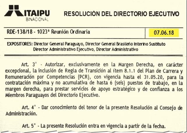 El texto de la normativa modificada versa textualmente: “autorizar, exclusivamente en la Margen Derecha, en carácter excepcional, la inclusión de Regla de Transición del Plan de Carrera y Remuneración por Competencia, con vigencia hasta el 31 de mayo de 2020, para la contratación máxima y no acumulativa de hasta seis puestos de trabajo, en la margen derecha, para prestar servicios de apoyo estratégico y de confianza a los Miembros Paraguayos del Directorio Ejecutivo”.