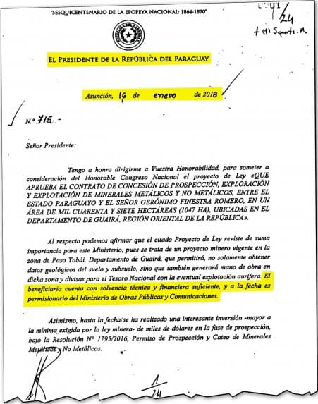 Según la ley 3150/2007 De Minas, el Estado podrá otorgar permisos de prospección, exploración o explotación solo a personas físicas o jurídicas con capacidad técnica y financiera probada, sin embargo, el presidente de la República, Horacio Cartes firmó un decreto en el cual no se tuvo en cuenta la capacidad técnica y financiera de Finestra Romero, quien no será el verdadero concesionario.