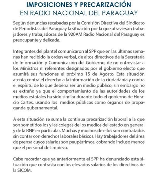 El Sindicato de Periodistas del Paraguay denunció que trabajadores de Radio Nacional del Paraguay, 920 AM han recibido órdenes explícitas de altos directivos de la Secretaría de Información y Comunicación del Gobierno, de no entrevistar a los ministros ni referentes designados por el nuevo Gobierno.