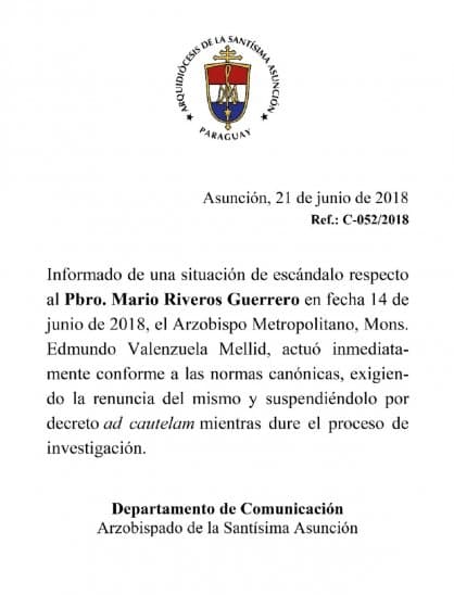 Por su parte, el padre Nelson Acosta, conversó con Noticias Paraguay y explicó que el presbítero Mario Riveros Guerrero habría mantenido relaciones sexuales con “una persona adulta”, faltando así al celibato.