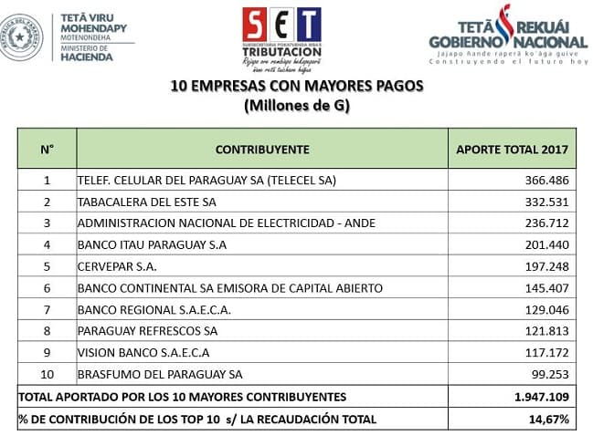 Cabe mencionar que en la lista, aparece la empresa del Presidente de la República, Horacio Cartes, la tabacalera Tabesa SA.