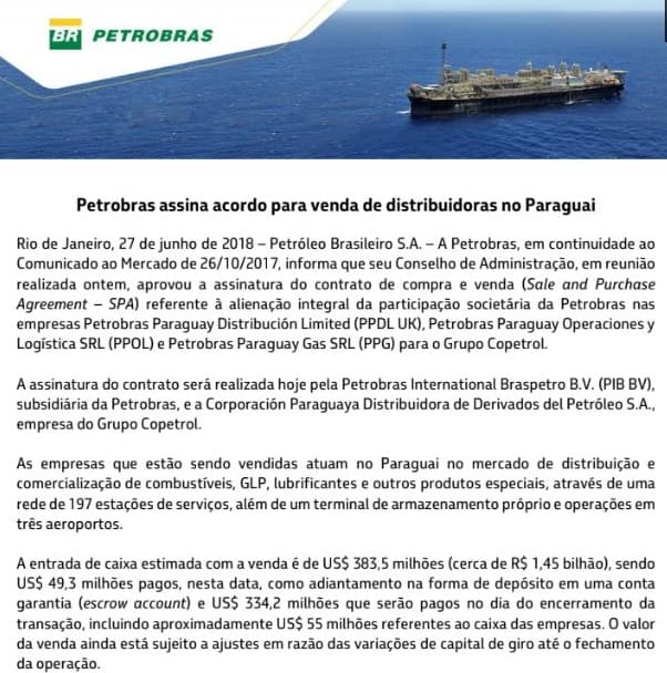 Según lo señalado por el medio brasileño, la transacción incluye las firmas Petrobras Paraguay Distribución Limited (PPDL UK), Petrobras Paraguay Operaciones y Logística SRL (PPOL) y Petrobras Paraguay Gas SRL (PPG).