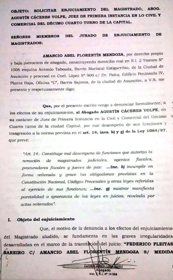 El documento de la denuncia, promovida por Florentín, cita “irregularidades en el marco de la tramitación de juicio ‘Federico Fleitas Bareiro c/ Amancio Abel Florentín s/ medida cautelar de urgencia’”.