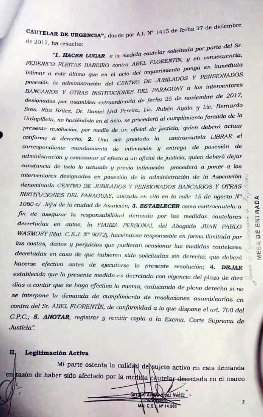 Según el documento proporcionado a RDN, la resolución del por entonces juez señalaba: “Hacer lugar a la medida cautelar solicitada por parte del Sr Federico Fleitas Bareiro contra Abel Florentín, y en consecuencia, intimar a este último que en el acto del requerimiento ponga en inmediata posesión la administración del Centro de Jubilados y Pensionados Bancarios y otras Otras Instituciones del Paraguay”.