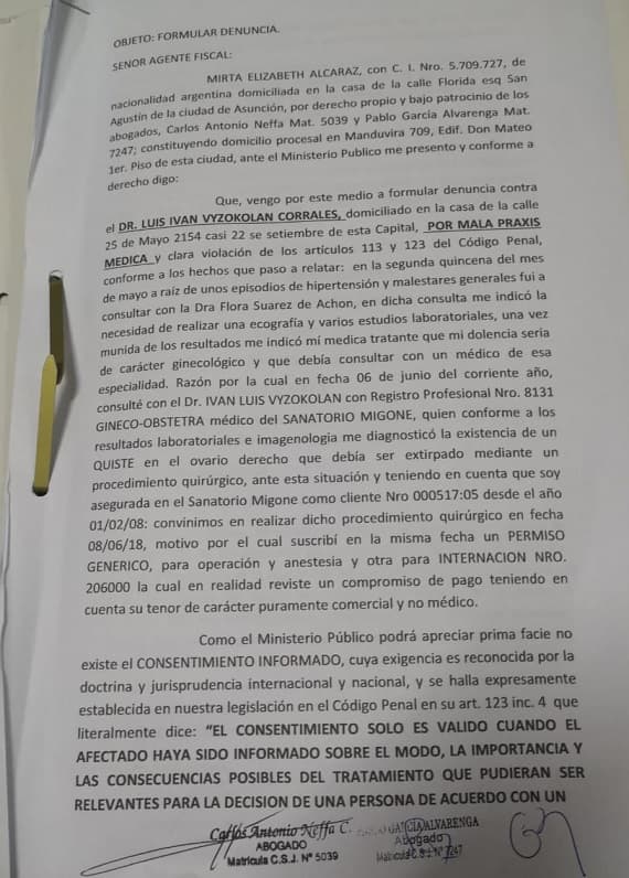 Actualmente se encuentra en marcha una denuncia penal contra Vyzokolán. En su momento, el profesional llegó a ofrecer G. 10 millones para reparar del daño, afirmando que no tenía dinero, según el abogado de la mujer.