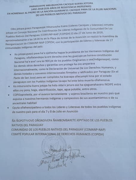 Vargas manifestó que permanecerán hasta la asunción del Presidente electo, Mario Abdo Benítez, con el fin de solicitarle una reunión con los 10 mil miembros de los diferentes pueblos originarios.
