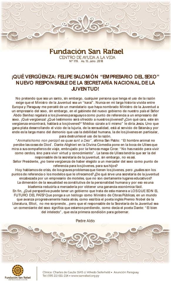 “Uno que gana plata desarrollando el vicio de la lujuria, de la sensualidad, está al servicio de Satanás y por ende es la larga mano del demonio que usa la debilidad humana, de los jóvenes en particular”, señala el escrito entre otras cosas.