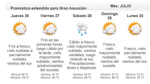La Dirección de Meteorología pronostica que esta jornada se presentará fresca, con el cielo mayormente nublado. Los vientos soplarán del sector sur.