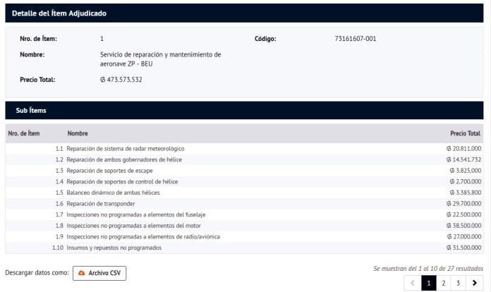Los informes indican que la adjudicación en 2014 se llevó a cabo para “el mantenimiento y reparación de las aeronaves del MAG". Dicha negociación fue por la suma de G. 400 millones.