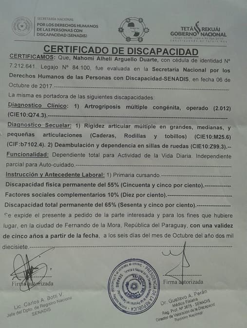 Acotó además que pasó mucho tiempo desde que el médico dio la orden de cirugía para su hija, y que actualmente se encuentra desesperada. Lamentó las dificultades por las que debió y debe atravesar para alcanzar ese dinero, ya que no es fácil solicitar ayuda, a pesar que es para una causa importante. Expresó su agradecimiento a todas las personas que en su momento ayudaron para llegar al monto con el que cuenta actualmente. “La gente más humilde es la que donó, tanto dinero como otras cosas para poder realizar actividades, son las personas de escasos recursos las que más ayudaron”, remarcó. Vuelve a recurrir al apoyo y la solidaridad para que su hermosa pequeña pueda cumplir su sueño, que es caminar. Puntualizó que necesitan un poco más de G. 10 millones para que posterior a la operación pueda seguir con su fisioterapia Naomi cursa el primer grado en la escuela “Doctor Ignacio A. Pane” de Asunción, es una niña aplicada, con mucha energía y con varios amigos que la quieren. Espera obtener su placa para que pueda iniciar un tratamiento y poder caminar.Caso