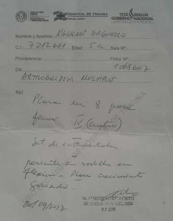 Liz Duarte es la madre de Nahomi Arguello Duarte, de seis años, quien sigue apelando a la solidaridad de la ciudadanía. Hace unos meses, Liz relató su historia a RDN. Comentó que precisaba con urgencias comprar unas placas para que su pequeña pueda operarse. Señaló que el material cuesta G. 30 millones y que por su condición económica era imposible comprar. La madre sostuvo que gracias al pedido de ayuda difundido por el medio, llegó el apoyo de mucha gente y logró concretar un poco más de G. 9 millones. Mencionó además que la Dirección de Beneficencia y Ayuda Socia (Diben) donó G. 10 millones para la placa; dicho monto ya fue depositado en su totalidad en la casa de venta del material. Indicó que mediante las actividades y la solidaridad cuenta con los G. 9 millones, pero que aún falta G. 10 millones para alcanzar el costo. Por la mencionada razón vuelve acudir y a solicitar el apoyo de la gente que desea ayudar a que su niña pueda caminar.