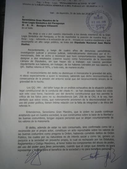 “Hizo designar a empleados, caseros suyos, como funcionarios de la Cámara de Diputados sin que hayan ido a trabajar. Sus caseros percibían regularmente sus haberes, e Ibáñez retenía el 50%”, sentencia una parte del comunicado.