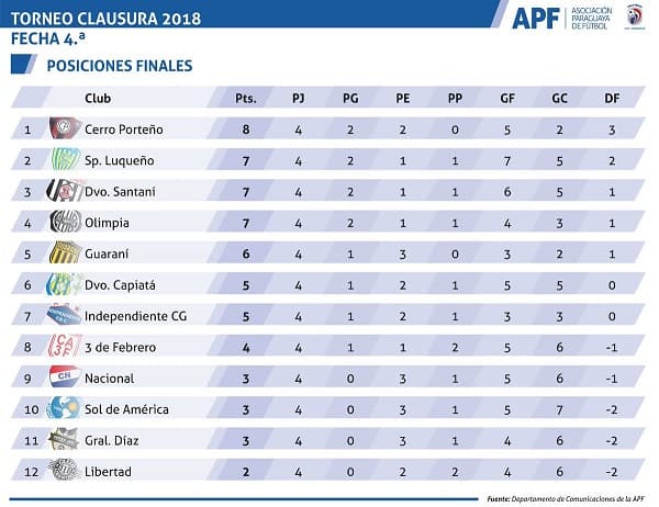 Cerro Porteño, tras superarle a Sol de América por 2-0, es actualmente el único líder en la tabla con 8 puntos, siendo escoltado por: Sportivo Luqueño, Deportivo Santaní y Olimpia, quienes tienen 7 puntos cada uno.
