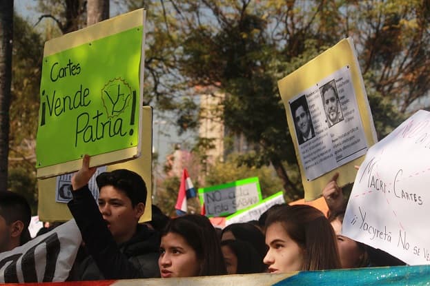 Los estudiantes portaban carteles alusivos al acuerdo de las notas reversales de Yacyretá, y alegaban que el presidente de la República, Horacio Cartes, es un “vende patria”.