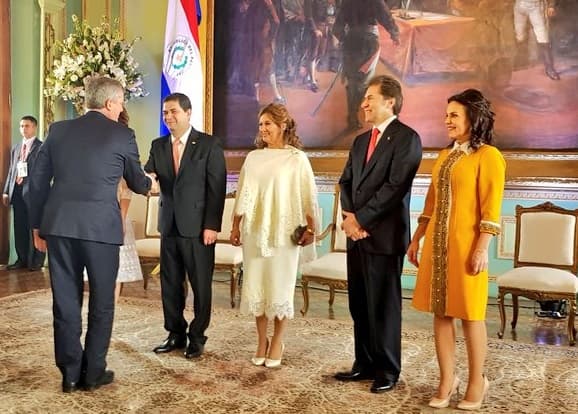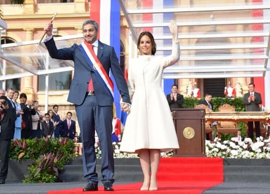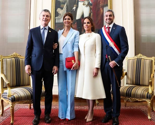 Mientras que María Gloria Penayo de Duarte, esposa de Nicanor Duarte Frutos, deslumbró con un vestido y saco al cuerpo, de color rojo, confeccionado en chantú.
