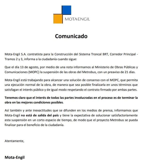 En un escueto comunicado, la firma Mota Engil asegura que desea solucionar el inconveniente que está atravesando y concluir con las obras del metrobús.
