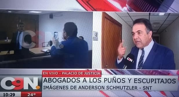 La pelea fue captada por las cámaras de C9N y muestra cómo se dio la confrontación. El Profe Mazier ingresó a la sala de juicio oral en la cual se encontraba Almada y lo escrachó.