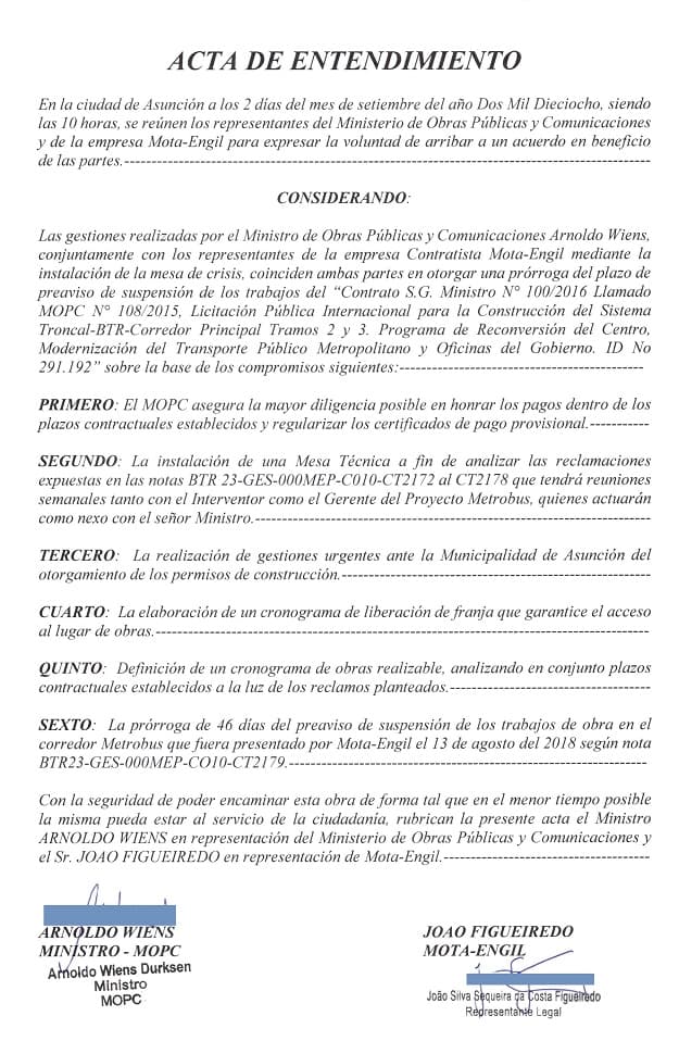 Según lo informado por la cartera de Estado, Joao Figueredo, representante de Mota-Engil, y Arnoldo Wiens, ministro de Obras Públicas y Comunicaciones, rubricaron un acta de entendimiento.