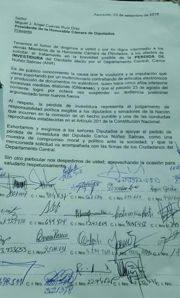 En el escrito se solicita la pérdida de investidura de Núñez Salinas, considerando el proceso al que está sometido.