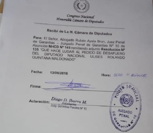 En la mañana de este jueves, el juez Rubén Ayala Brun recibió la comunicación del desafuero del diputado Ulises Quintana quien está imputado por tráfico de drogas en calidad de cómplice, enriquecimiento ilícito, lavado de dinero y tráfico de influencia.