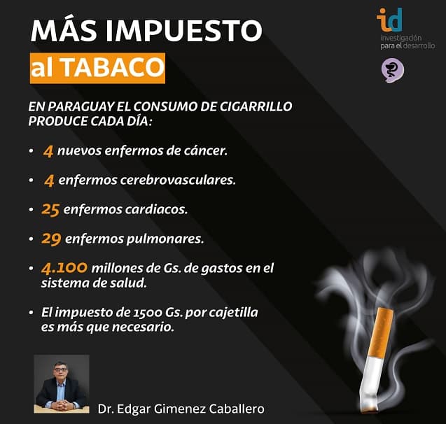 El doctor e investigador Edgar Giménez Caballero, manifestó a RDN que “un impuesto que cobre 1.500 guaraníes por cada cajetilla podría aportar importantes recursos para la salud, a la vez de persuadir a adolescentes y jóvenes de este vicio”.