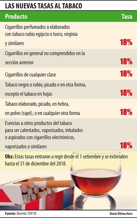 En tanto que en Diputados se dispuso el incremento del 18 %. El proyecto no fue del agrado del exmandatario Horacio Cartes, ya que afectaba posiblemente a una de sus empresas más conocidas, Tabacalera del Este SA (Tabesa).